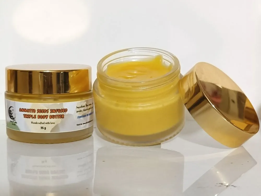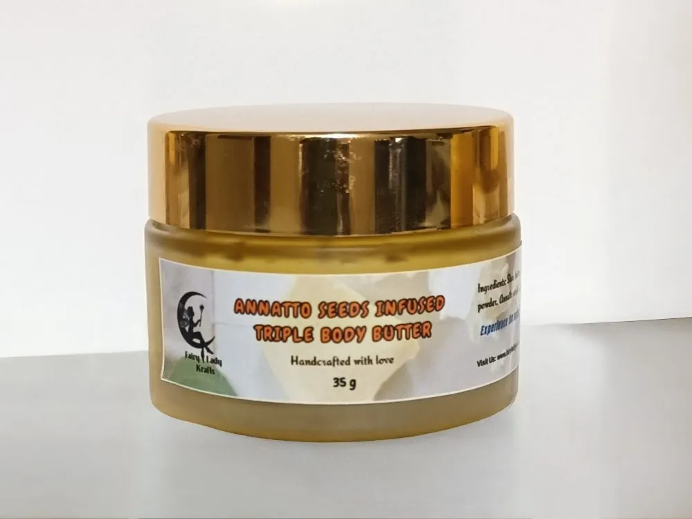 Indulge in Annatto Seeds Infused Triple Body Butter, a luxurious, handcrafted, water-free formula that delivers holistic skin care from the very first application. The triple-butter blend drenches skin in long-lasting moisture, while annatto Seeds extract helps brighten and even out skin tone naturally. Packed with vitamins and antioxidants, it nourishes deeply, supports elasticity, and reduces fine lines. Gentle, non-greasy, and preservative-free, it melts into the skin effortlessly, repairing dryness, fortifying the barrier, and comforting stretch-mark-prone areas. Pure, clean, chemical-free care—safe for all skin types, including kids.